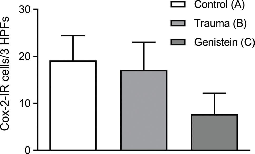 Cox-2 immunoreactivity scoring. Significant difference (P = 0.008) was found between the genistein (C) and other groups (A, B). The highest number of Cox-2 IR cells per 3 HPFs was observed in the control group (A white bar) and the trauma group (B light gray bar). The lowest number of Cox-2-IR cells was observed in the genistein group (C dark gray bar). Bars indicate means. Error bars (SD). Cox-2, cyclo-oxygenase-2; HPFs, 400× high-powered fields; IR, immunoreactive.