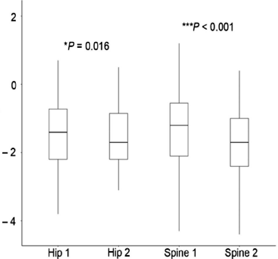 | Characteristic | First DXA | Follow-up DXA | ||||||