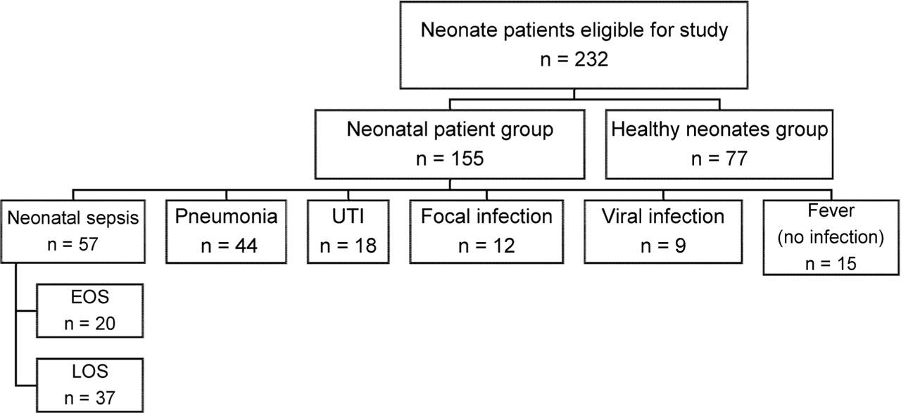 | Neonatal sepsis (n = 57) | Pneumonia (n = 44) | UTI (n = 18) | Focal infection (n = 12) | Viral infection (n = 9) | Fever (no infection) (n = 15) | Healthy neonatal control group (n = 77) | |