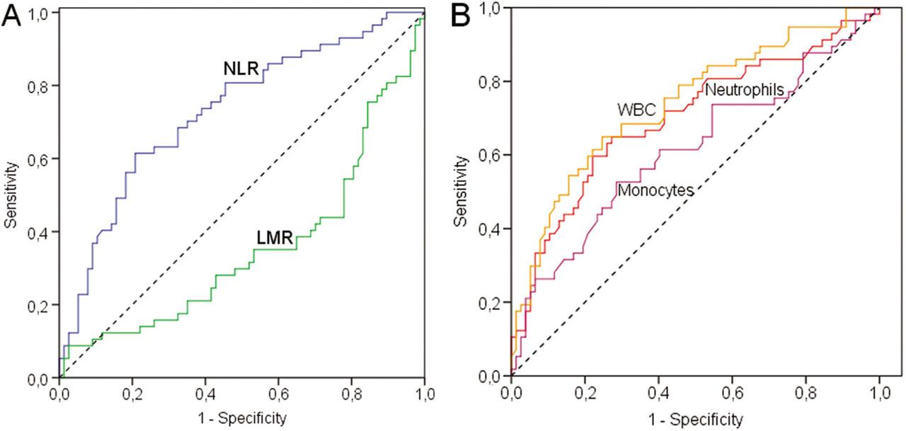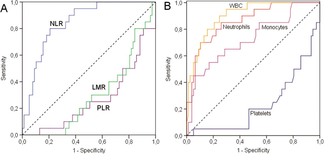 ROC analysis results for NLR, LMR, PLR, and peripheral blood count in patients with neonatal sepsis