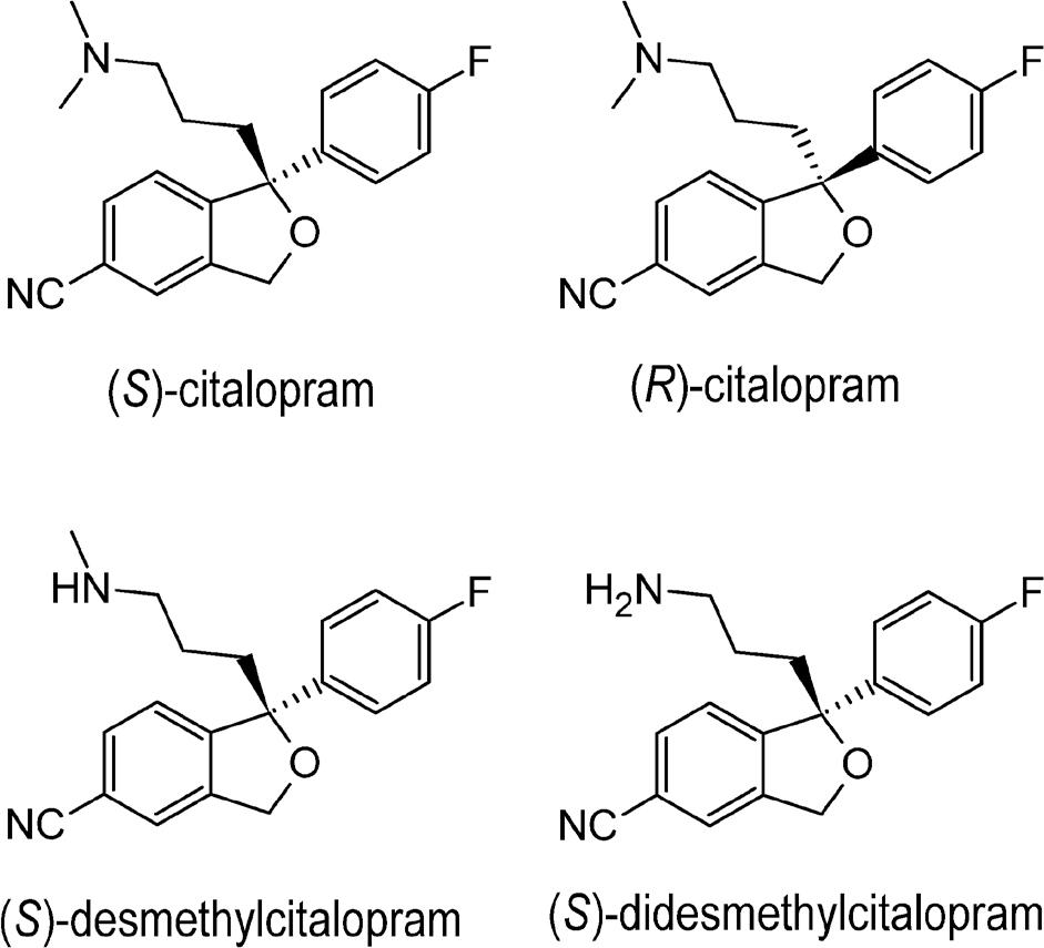 Citalopram is a commonly utilized antidepressive agent of the SSRI family [16, 17]. The structure of citalopram or (RS)-1-[3-(dimethylamino)propyl]-1-(4-fluorophenyl)-3H-2-benzofuran-5-carbonitrile is presented in Figure 1. Citalopram has 1 asymmetric center and was originally marketed as a racemate (equimolar ratio of (R)- and (S)-citalopram). As found in numerous studies in vitro and in vivo, (S)-citalopram is pharmacologically more active, with (S)-desmethylcitalopram [(S)-d-citalopram] being active to a smaller extent [18]. Investigations have also indicated (R)-citalopram to be therapeutically dormant and to reduce the activity of (S)-citalopram [19]. After administering (RS)-citalopram, the plasma level of (S)-citalopram is roughly a third of the overall drug, although it is uncertain whether the relatively frequent removal of (S)-citalopram is attributed to the stereoselective activity of cytochrome P450 (CYP) enzymes in the liver [20,21,22].