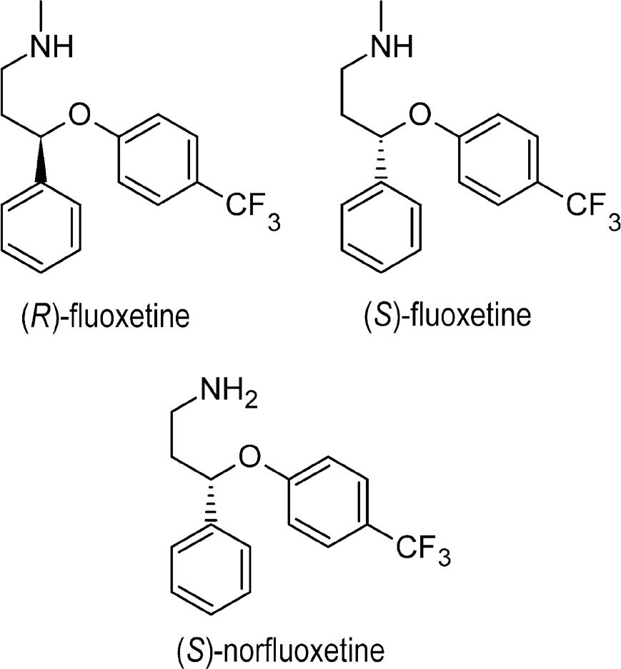 Fluoxetine belongs to the important class of antidepressive agents, the SSRIs. Fluoxetine or N-methyl-3-phenyl-3-[4-(trifluoromethyl)phenoxy]propan-1-amine was the first SSRI therapy introduced and has been used to treat major depressive disorder, panic disorder, obsessive–compulsive disorder, premenstrual dysphoric disorder, and nervous bulimia [37, 38]. Fluoxetine contains a chiral center (Figure 2). Unlike citalopram, fluoxetine could not be developed as a single-enantiomeric form and is still sold as a racemate. Both (R)- and (S)-fluoxetine display similar activity in blocking serotonin reuptake; however, the 2 enantiomers are metabolized differently [39, 40]. Administration of (R)-fluoxetine leads to less-variable plasma concentrations of fluoxetine and its active metabolites than (RS)-fluoxetine. The (R)-enantiomer and its metabolites inhibit CYP2D6 to a lesser extent than the (S)-enantiomer and its metabolites [41]. The racemate of fluoxetine has been observed to be a safe and efficient anti-depressive agent for >15 years, and (R)-fluoxetine is not used due to safety issues.
