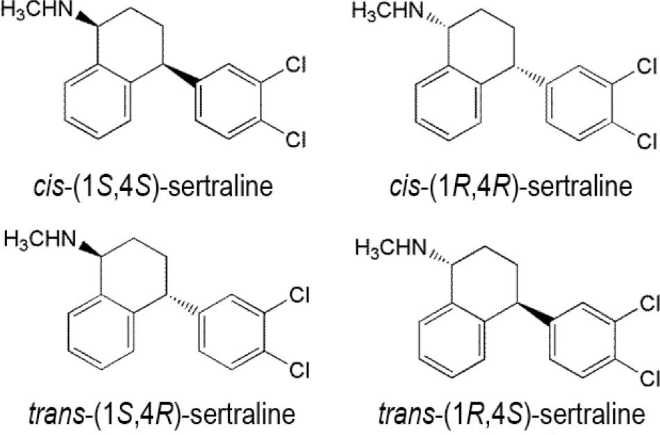 The structure of sertraline comprises 2 stereocenters and thus has 4 stereoisomers, but it is sold as a single enantiomer because only the stereoisomer with the 1S,4S configuration is clinically effective [51]. Across its preparation, substantial amounts of (−)-cis-(1R,4R)-N-methyl-4-(3,4-dichlorophenyl)-1,2,3,4-tetrahydro-1-naphthalenemine hydrochloride, trans-(1S,4R), and (1R,4S)-N-methyl-4-(3,4-dichlorophenyl)-1,2,3,4-tetrahydro-1-naphthalenemine hydrochloride are produced, which are considered as impurities (Figure 3). The stereoisomer used for the treatment has a configuration (+)-cis-(1S,4S).