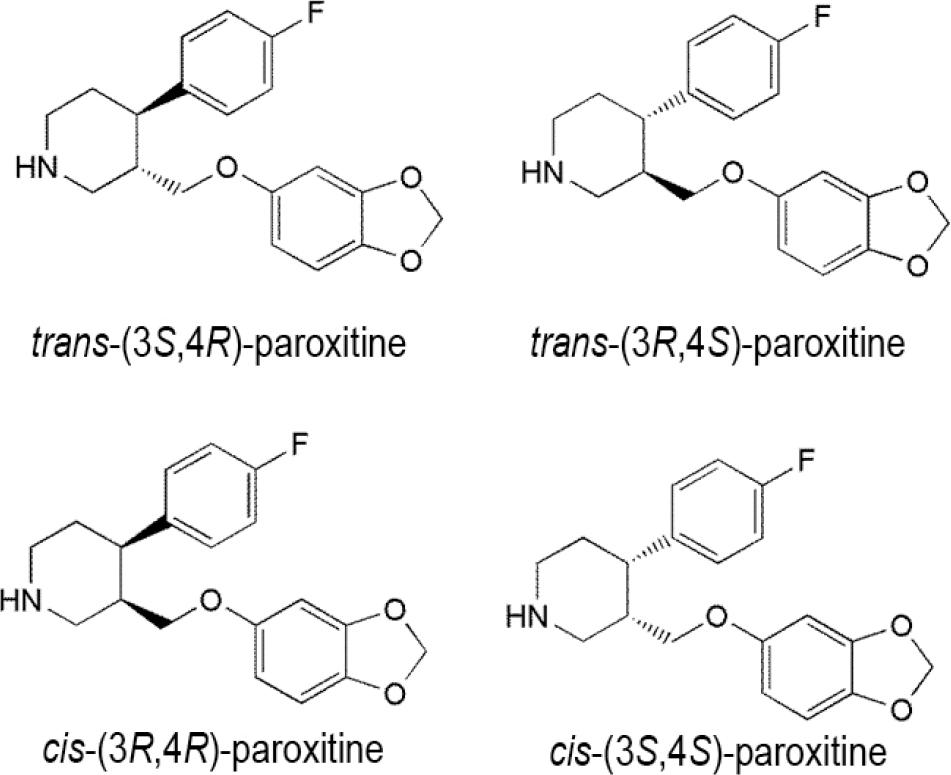 Paroxetine is another SSRI used in the treatment of all kinds of depressive disorders. The paroxetine enantiomer used in therapeutics is (−)-trans-(3S,4R)-3-(1,3-benzodioxol-5-hydroxymethyl)-4-(4-fluorophenyl)piperidine (Figure 4); it is composed of 2 asymmetric centers and can form 4 stereoisomers, of which 2 have trans and 2 have cis conformations. Paroxetine is sold as an individual enantiomer, that is, the (−)-trans-(3S,4R) stereoisomer, which is therapeutically more active than the other stereoisomers [53]. However, in drug preparations, its inactive enantiomer, (+)-trans-paroxetine, may also be present [54].
