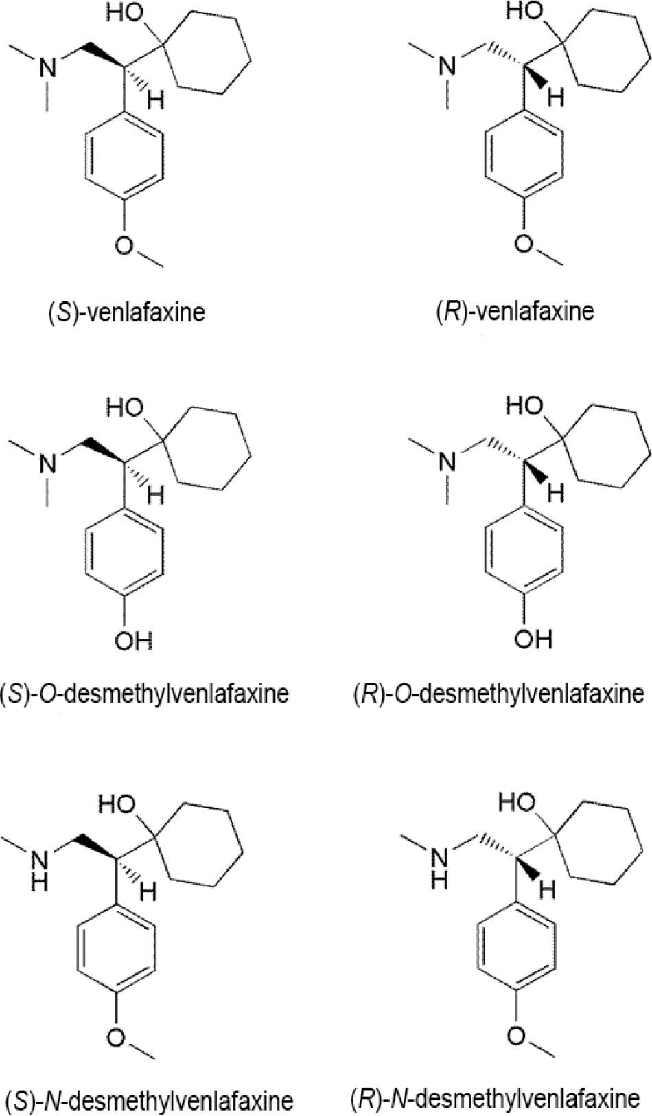 (S)-Venlafaxine displays greater potency toward CYP2D6 as an inhibitor than (R)-venlafaxine in vitro; it is selectively metabolized at clinical doses by CYP2D6 in humans, whereas the opposite occurs at high doses [59, 60]. Venlafaxine is primarily metabolized in the liver to O-desmethylvenlafaxine, N-desmethylvenlafaxine, N,O-didesmethylvenlafaxine, and potent metabolites, which are also chiral compounds. The major metabolic route in humans is the O-demethylation of racemic venlafaxine to O-desmethylvenlafaxine, while N-demethylation of the alkylamino side chain in N-desmethylvenlafaxine and the removal of both O-methyl and N-methyl groups in N,O-didesmethylvenlafaxine are the minor routes. Among these, the O-desmethyl derivative maintains similar pharmacological interaction as the parent drug, whereas the N-desmethyl derivative is also effective, although it is a weaker inhibitor of serotonin and norepinephrine reuptake than venlafaxine [61]. The (R)- and (S)-enantiomeric forms of the metabolites preserve their parent drug's respective effectiveness to inhibit serotonin and norepinephrine reuptake [61].