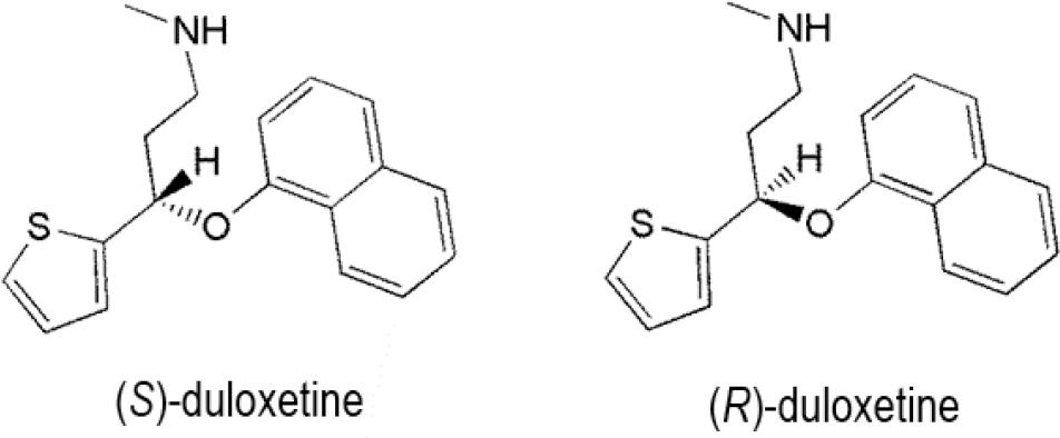 Duloxetine or (+)-S-N-methyl-3-naphthalene-1-yloxy-3-thiophen-2-ylpropan-1-amine (Figure 6) is an important SNRI used to treat major depression, general anxiety, fibromyalgia, and chronic pain [62, 63]. It may also be used to treat certain medical problems such as urinary incontinence, in addition to the treatment of psychiatric disorders [64]. It has a chiral center and is applied as a single enantiomer in medication, namely, as (S)-duloxetine. Both the enantiomeric forms of duloxetine effectively inhibit norepinephrine and serotonin reuptake, although the (S)-form is 2-fold more active than the (R)-form and is sold as a single-enantiomeric form for clinical therapy [65, 66]. Studies on the binding of duloxetine enantiomers to human serum albumin indicate that the binding constant for the (R)-enantiomer is greater than that for rac-duloxetine. Moreover, the effect of pH on the binding constants showed that at pH 7.4, both (R)-enantiomer and rac-duloxetine showed similar binding, but at higher pH (8.5), (R)-duloxetine showed better binding ability than racduloxetine [67].