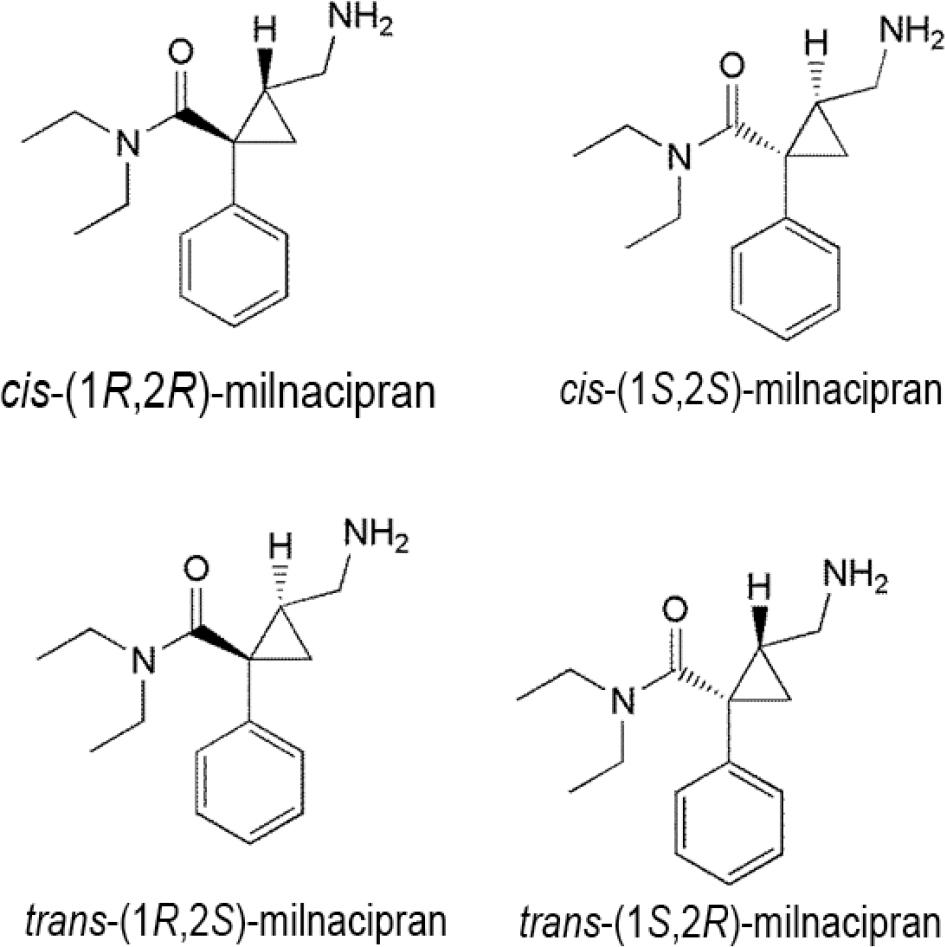 Milnacipran is an SNRI accepted for the treatment of fibroma by the U.S. FDA and for the treatment of depression by agencies elsewhere [69]. Milnacipran or (2-(aminomethyl)-N,N-diethyl-1-phenylcyclopropane-1-carboxamide) possesses 2 chiral centers in its structure (Figure 7) and is available as an equimolar mixture of the cis isomers with the following conformation: d-milnacipran (1S,2R) and l-milnacipran (1R,2S). Pharmacokinetic studies in humans [70, 71] have demonstrated a median peak plasma time (tmax) of 2 h. Milnacipran is steadily absorbed from the gastrointestinal system. The absolute oral bioavailability of milnacipran is large (85%), and diet does not affect absorption. The plasma half-life is around 8 h, and approximately 50%–60% of milnacipran is excreted unaltered in the urine. When administered orally, nearly the entire dose (about 93%) is eliminated steadily in the urine.