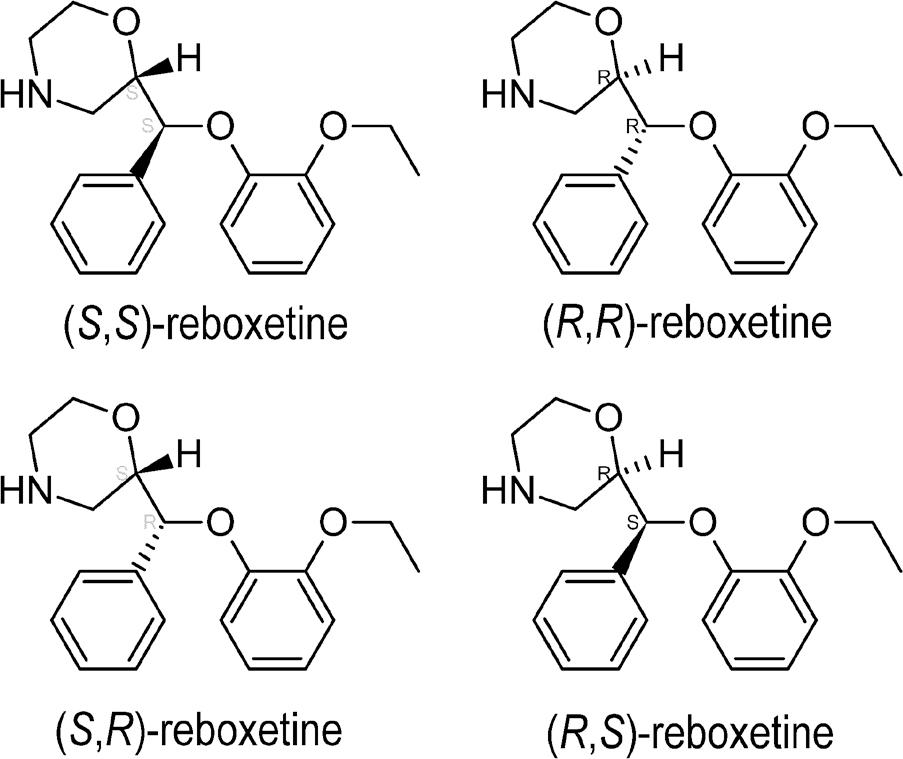 Reboxetine or (2RS)-2-[(RS)-(2-ethoxyphenoxy)-phenylmethyl]morpholine is the most effective NRI medication used to manage anxiety. Reboxetine has 2 chiral centers (Figure 8) and can therefore appear as a racemate; nevertheless, during enantioselective synthesis, mostly (R,R)-, and (S,S)-reboxetine are formed [72]. Therefore, it is available as a racemate in clinical preparations. However, the 2 enantiomers show substantially different pharmacological properties [73, 74]. For instance, the Cmax and AUC0–tz of (R,R)-reboxetine are greater than those of (S,S)-reboxetine [75]. Conversely, several reports indicate that (S,S)-reboxetine is a more active NRI than (R,R)-reboxetine [76] and is accountable for the vasomotor and adverse effects of reboxetine on the heart [77].