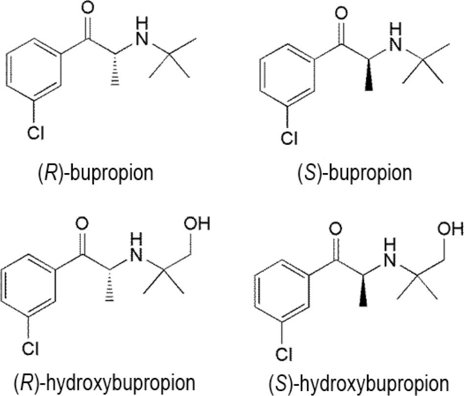 Bupropion ((±)-2-(tert-butyl amino)-1-(3-chlorophenyl)propane-1-one) is an important member of the NDRI class and has 1 chiral center (Figure 9). It is used clinically as a racemic mixture [81, 82] and as its pure enantiomers [83]. The (R)-enantiomer is more effective than the (S)-enantiomer [84]. Bioactivation of bupropion is catalyzed predominantly by stereoselective CYP2B6 and CYP2B6-catalyzed bupropion hydroxylation [85].