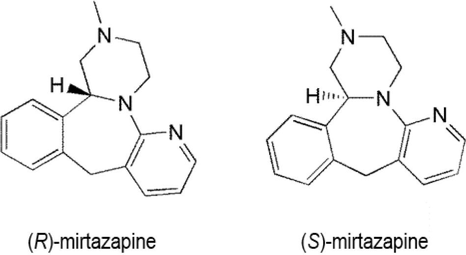 Mirtazapine (Figure 12) is a recently developed noradrenergic and powerful serotonergic antidepressive agent commonly administered as a racemate despite the multiple therapeutic actions of the enantiomers. Both stereoisomers have pharmacological effects that seem to predict antidepressant activity. Its (S)-form is the more powerful antagonist of receptors of the type α2-autoreceptor and 5-HT type-2, while the (R)-enantiomer primarily acts on α2-heteroreceptors and 5-HT type-3 receptors [107]. Mirtazapine enantiomers are metabolized predominantly by hydroxylation, demethylation, and N-oxidation reactions of various CYP enzymes [108].