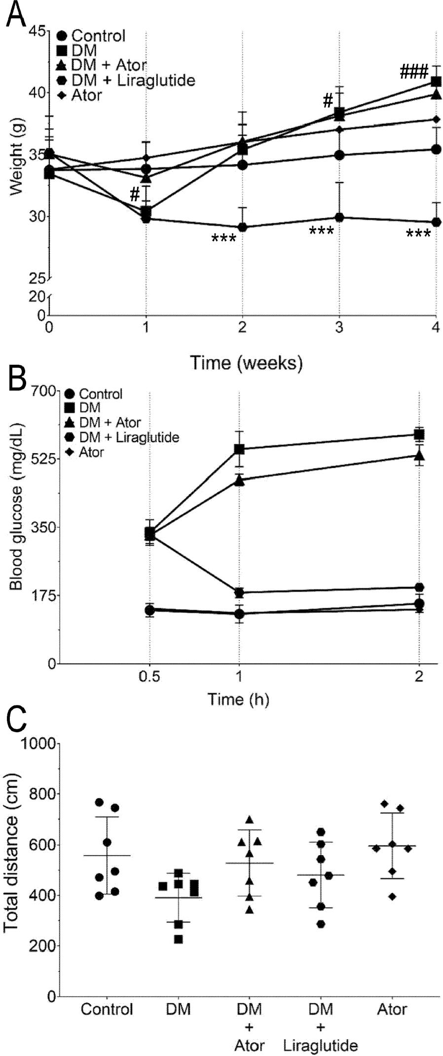 (A) Mouse weight throughout the experiment analyzed with a general linearized model. #P < 0.05, ###P < 0.001 alloxan-induced diabetes vs. vehicle control. ***P < 0.001 liraglutide + alloxan-induced diabetes vs. alloxan-induced diabetes. (B) Blood glucose levels after oral glucose administration for each experimental group in the OGTT. (C) Locomotor activity for each experimental group. Statistical analyses were conducted using a one-way ANOVA with a Tukey post hoc test. Data are represented as mean ± standard deviation. ANOVA, analysis of variance; Ator, atorvastatin; Control, saline vehicle treatment alone as a negative control; DM, alloxan-induced model of diabetes mellitus; OGTT, oral glucose tolerance test.