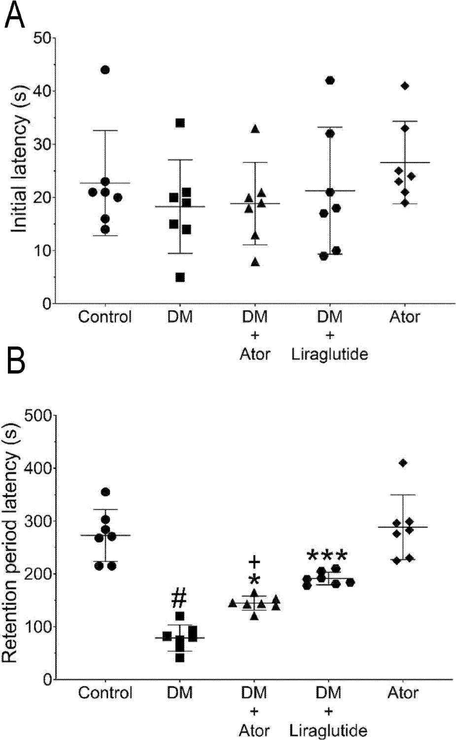 Effect of each drug treatment on (A) initial latency and (B) retention period latency in the passive avoidance test. There were no significant differences in initial latency between experimental groups. Alloxan-induced diabetes significantly decreased retention period latency. #P < 0.05 vs. vehicle control. Atorvastatin significantly attenuated the alloxan-induced diabetes decrease in retention period latency. *P < 0.05 vs. alloxan-induced diabetes; +P < 0.05 vs. alloxan-induced diabetes + liraglutide. Liraglutide also significantly attenuated the alloxan-induced diabetes decrease in retention period latency even more than atorvastatin. ***P < 0.001. Symbols represent each data point and the bar indicates mean ± standard deviation. Statistical analyses were performed using a Kruskal–Wallis test. Ator, atorvastatin; Control, saline vehicle treatment alone as a negative control; DM, alloxan-induced model of diabetes mellitus.