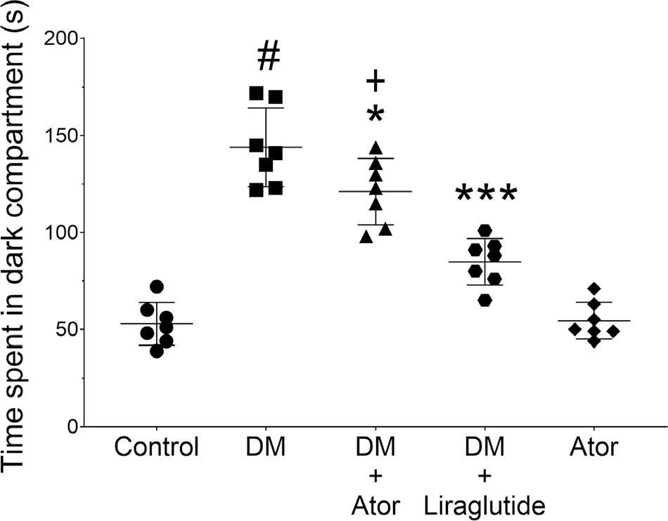 The amount of time spent in the dark compartment by mice in each experimental group. Alloxan-induced diabetes significantly increased the time spent in the dark compartment. #P < 0.05 vs. saline vehicle control. Atorvastatin attenuated this increase in mice with alloxan-induced diabetes. *P < 0.05 vs. alloxan-induced diabetes; +P < 0.05 vs. alloxan-induced diabetes + liraglutide. Liraglutide significantly attenuated the time mice with alloxan-induced diabetes spent in the dark compartment. ***P < 0.001 vs. alloxan-induced diabetes. Symbols represent each data point and the bars indicate mean ± standard deviation. Statistical analyses were performed using a one-way ANOVA with a Tukey post hoc test. ANOVA, analysis of variance; Ator, atorvastatin; Control, saline vehicle treatment alone as a negative control; DM, alloxan-induced model of diabetes mellitus.