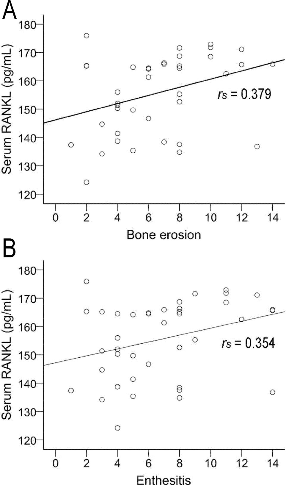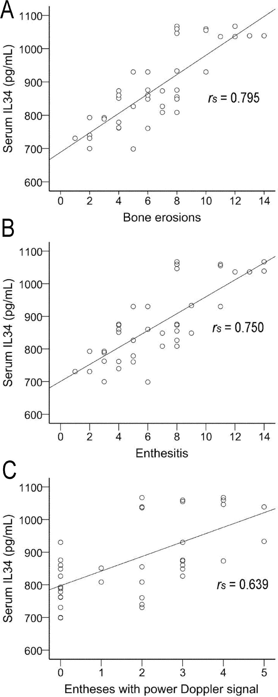 Correlation (rs) between IL-34, RANKL, and ultrasonography findings in 40 patients with AS