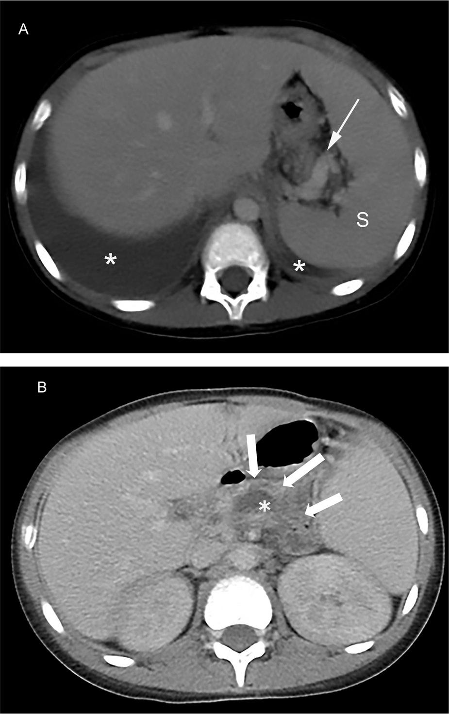 | Pancreatic parenchymal edema by US, CT, MRCP | 0/6, 1/12, 0/7 |