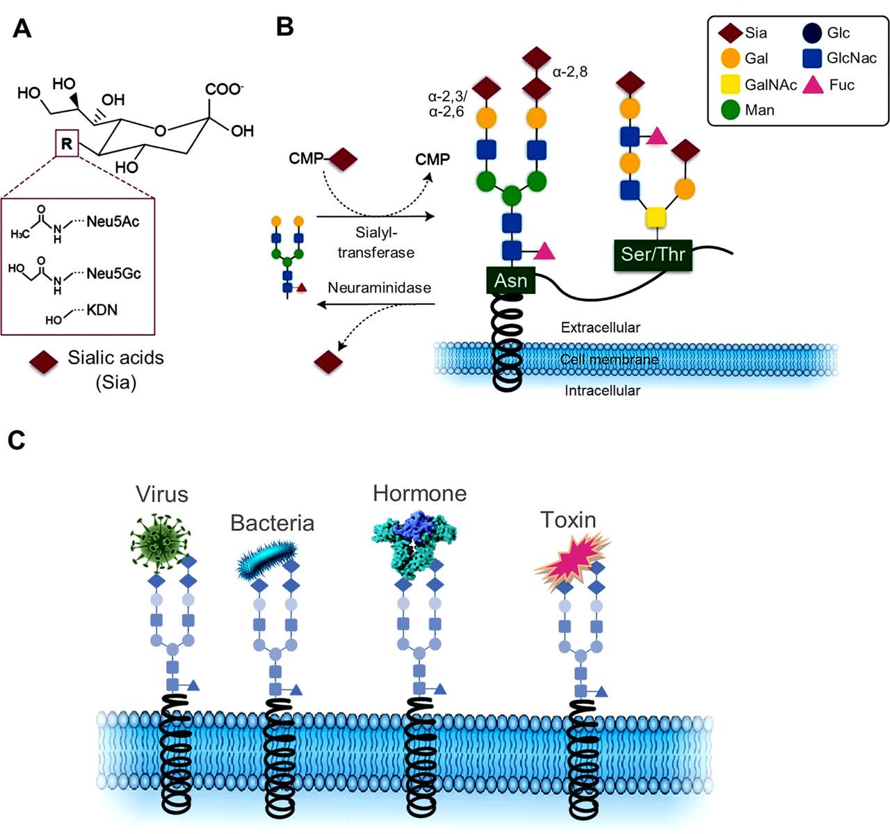 | Influenza A virus | Alphainfluenza-virus | Orthomyxoviridae | ssRNA | Yes | Neu5Acα2-3/6Gal, Neu5Acα23/6GalNAc, Neu5Acα2-6GlcNAc | HA, NA | Birds and mammals | [8, 13,14,15, 95] |
