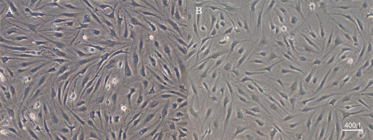 Morphology of chondrocytes in the 2 groups (×100). A. Chondrocytes in the experimental group were cultured with SDF-1 for 48 h. B. Morphology of chondrocytes in the control group. SDF-1, stromal cell-derived factor-1.