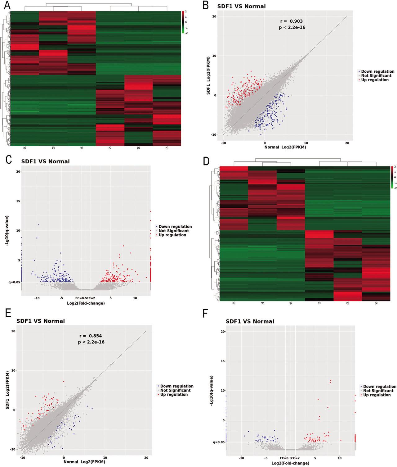 Analysis of miRNAs and lncRNAs. A. Heatmap of the differentially expressed (DE) miRNAs. B. Scatter plot of the DE miRNAs. C. Volcano plot of the DE miRNAs. D. Heatmap of the DE lncRNAs. E. Scatter plot of the DE lncRNAs. F. Volcano plot of the DE lncRNAs. In the heatmap, red represents upregulated miRNAs or lncRNAs, and green represents downregulated miRNAs or lncRNAs. In the scatter plot, the X and Y values are the average normalized signal values, shown on a log2 scale. The red and green lines were set as FC lines with a default change of 2.0. Red points (FC >2) indicate upregulated miRNAs or lncRNAs, and blue points (FC ≤2) indicate downregulated miRNAs or lncRNAs. In the volcano plot, the X-axis is the FC (log2), and the Y-axis is P (−log10). Red points (FC >2) indicate upregulated miRNAs or lncRNAs, and blue points (FC ≤2) indicate downregulated miRNAs or lncRNAs. DE, differentially expressed; FC, fold change; FPKM, fragments per kilobase of transcript per million mapped fragments; lncRNAs, long noncoding ribonucleic acids; miRNAs, microRNAs; SDF1, stromal cell-derived factor-1 treated articular chondrocytes. Normal indicates articular chondrocytes untreated with SDF-1.