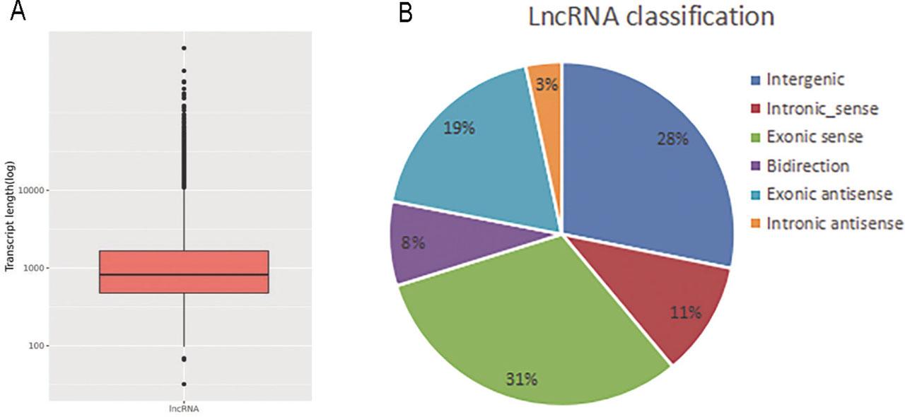 The top 10 most upregulated and most downregulated lncRNAs in the experimental group are shown in Table 1. Horizontal comparisons based on the transcript structure of the lncRNAs were performed, including the transcript length distribution, classification, and exon quantity differences. The length of lncRNAs was mainly concentrated at approximately 1000 bp, and lncRNAs constituted various RNA molecules (Figure 3A). The traditional classification method of lncRNAs is based on the location of the transcript in the genome and includes 5 major categories: (1) the sense group, (2) the antisense group, (3) the bidirectional group, (4) the intronic group, and (5) the intergenic group (Figure 3B).