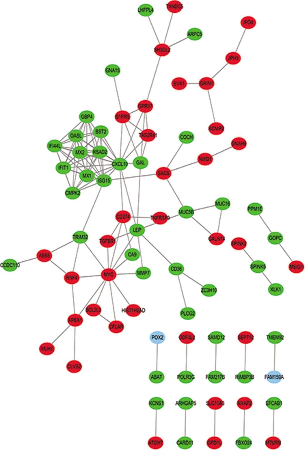 PPI network analysis of the top 10 differentially expressed genes. Nodes represent genes for the proteins indicated. Lines indicate interactions between genes. Red indicates upregulated genes, and green indicates downregulated genes. PPI, protein–protein interaction.