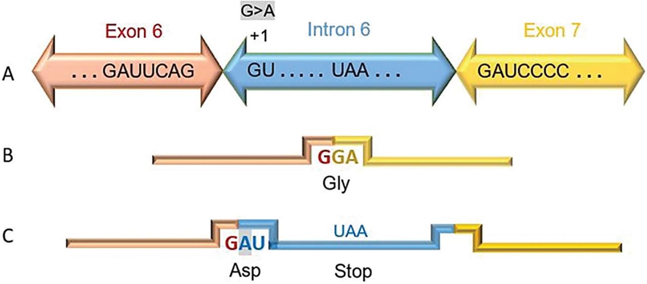 Comparison of normal CSS, GT, in the intron 6 of FAT4 and its mutant, AT, by in silico splice prediction tools and two predicted cryptic donor sites