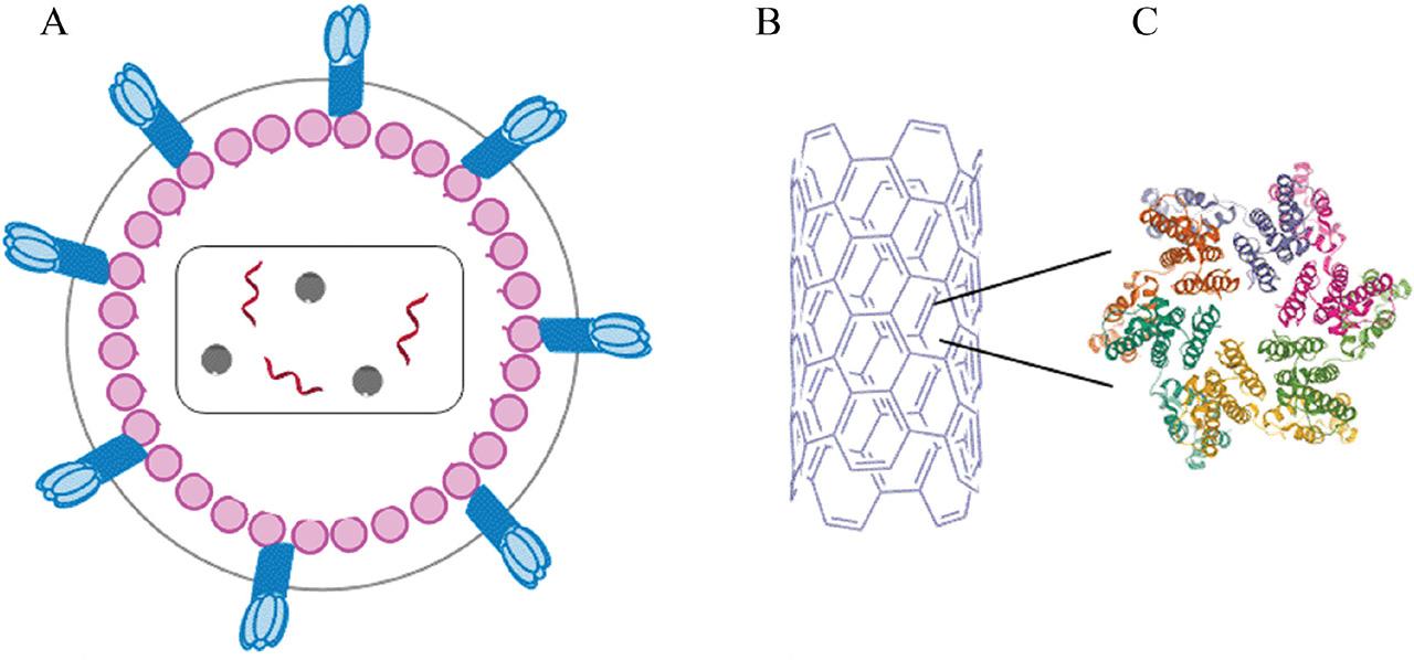 Structure of HIV and p24 antigen. (A) A complete virion, (B) capsid fullerene cone superstructure, and (C) monomer unit [8]. HIV, human immunodeficiency virus.