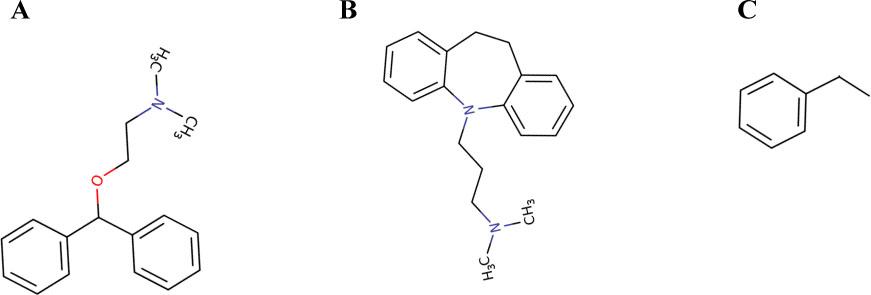 The chemical structure of dephenhydramine (A), imipramine (B) and the common substructure of dephenhydramine and imipramine (C). The similarities are as follow: AP Tanimoto: 0.421642, MCS Tanimoto: 0.2500, MCS Size: 8 and SMILES of common substructure: C(C)c1ccccc1. AP, atom pairs; MCS, maximum common substructure; SMILES, simplified molecular-input line-entry system.