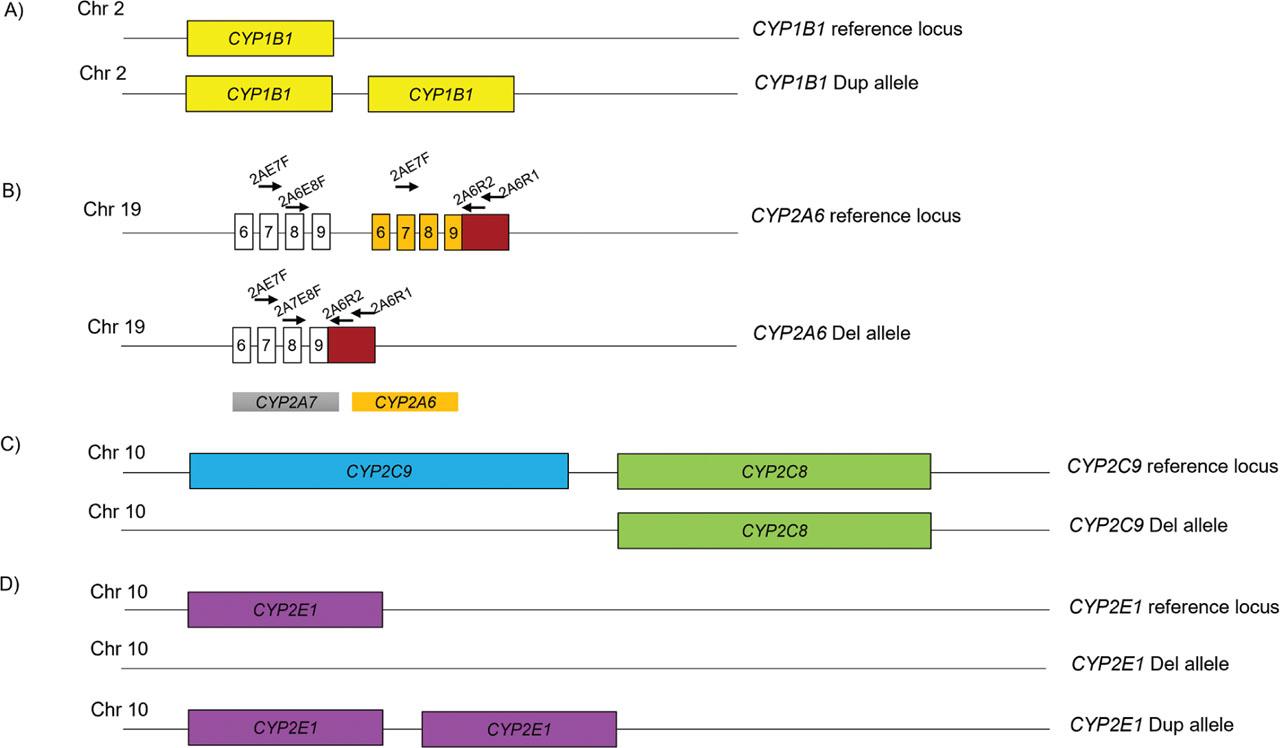 Graphical illustration of CYP450 CNVs identified in current study. (A) Reference gen locus of CYP1B1 (up) and CYP1B1Dup allele (down). CYP1B1 located on chromosome 2 and represented by yellow boxes. (B) Reference gen locus on chromosome 19 of CYP2A6 (orange box) and pseudogene CYP2A7 (grey box) (up) and CYP2A6Del allele (down), downstream of exon 9 of CYP2A6 is denoted by the black boxes. Primers position and strategy used for CYP2A6 del allele detection are also shown. (C) Reference gene cluster on chromosome 10 including CYP2C9 (blue box), CYP2C8 (green box) (up), and CYP2C9 Del allele (down). (D) Reference gen locus of CYP2E1 (pink box) on chromosome 10 (up), CYP2E1Del allele (middle), and CYP2E1Dup allele with 2 copies of the gene (down). CNVs, copy number variations.