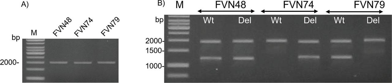 Copy number confirmation of CYP2A6Del. (A) Amplification of a part of CYP2A6 gene or hybrid CYP2A7/2A6 using primer pair 2AE7F/2A6R1 resulting in approximately 2 kb products. (B) Detection of CYP2A6Del allele, Wt: Wild-type allele, Del: Deletion allele. CYP2A6 genotype of tested samples were as follows: FVN48: Wt/Del, FVN74: Del/Del, FVN79: Wt/Wt.
