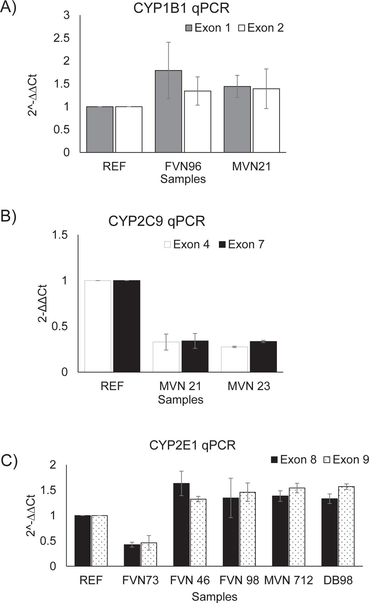 Copy number confirmation of CYP1B1, CYP2C9, and CYP2E1. Primers for real-time PCR located in exon 1 and exon 2 of CYP1B1, exons 4 and 7 of CYP2C9, exons 8 and 9 of CYP2E1 were used to confirm CNVs detected by MLPA in these genes. REF: reference samples, in which MLPA showing 2 copies of gene of interest. (A) Heterozygous duplications of CYP1B1 detected in both FVN 96 and MVN 21. (B) Heterozygous deletions of CYP2C9 were found in both MVN 21 and MVN 23. (C) Copy number confirmation of CYP2E1 showed that heterozygous deletion was detected in FVN 73 while heterozygous duplications were identified in FVN 46, FVN 98, Kinh 712 and DB98. CNVs, copy number variations; MLPA, multiplex ligation-dependent probe amplification.