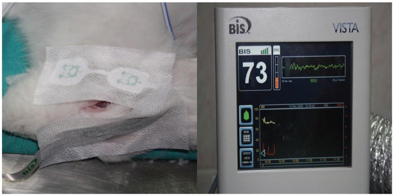 Routine monitoring during anesthesia included 5-lead ECG, invasive arterial blood pressure monitoring, oxygen saturation measurement with the use of a pulse oximeter (BeneView T5 Patient Monitoring System, Shenzhen Mindray Bio-Medical Electronic CO. LTD.), bispectral index (BIS Vista Monitoring system, Aspect Medical Systems Inc.; Figure 1), rectal temperature monitoring, and hourly urinary output after necessary catheterizations (Kendall Curity Foley Catheters, Tyco Healthcare) were inserted. To prevent hypothermia, the animals were actively heated externally (Temperature Management Unit Model 505, Bair Hugger Therapy). The animals were repositioned every 6 h and received subcutaneous 100 IU of enoxaparine (Clexane, Sanofi Aventis) once in every 12 h to prevent thrombosis (Figure 2).
