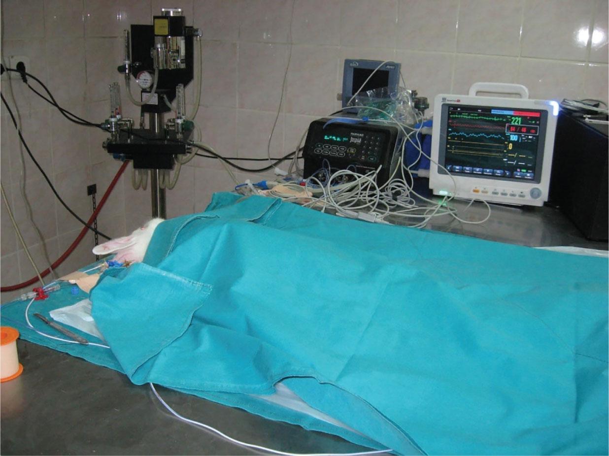 After standard premedication and anesthesia induction as described above, the sixteen rabbits were randomly divided (computer based) into 4 groups.