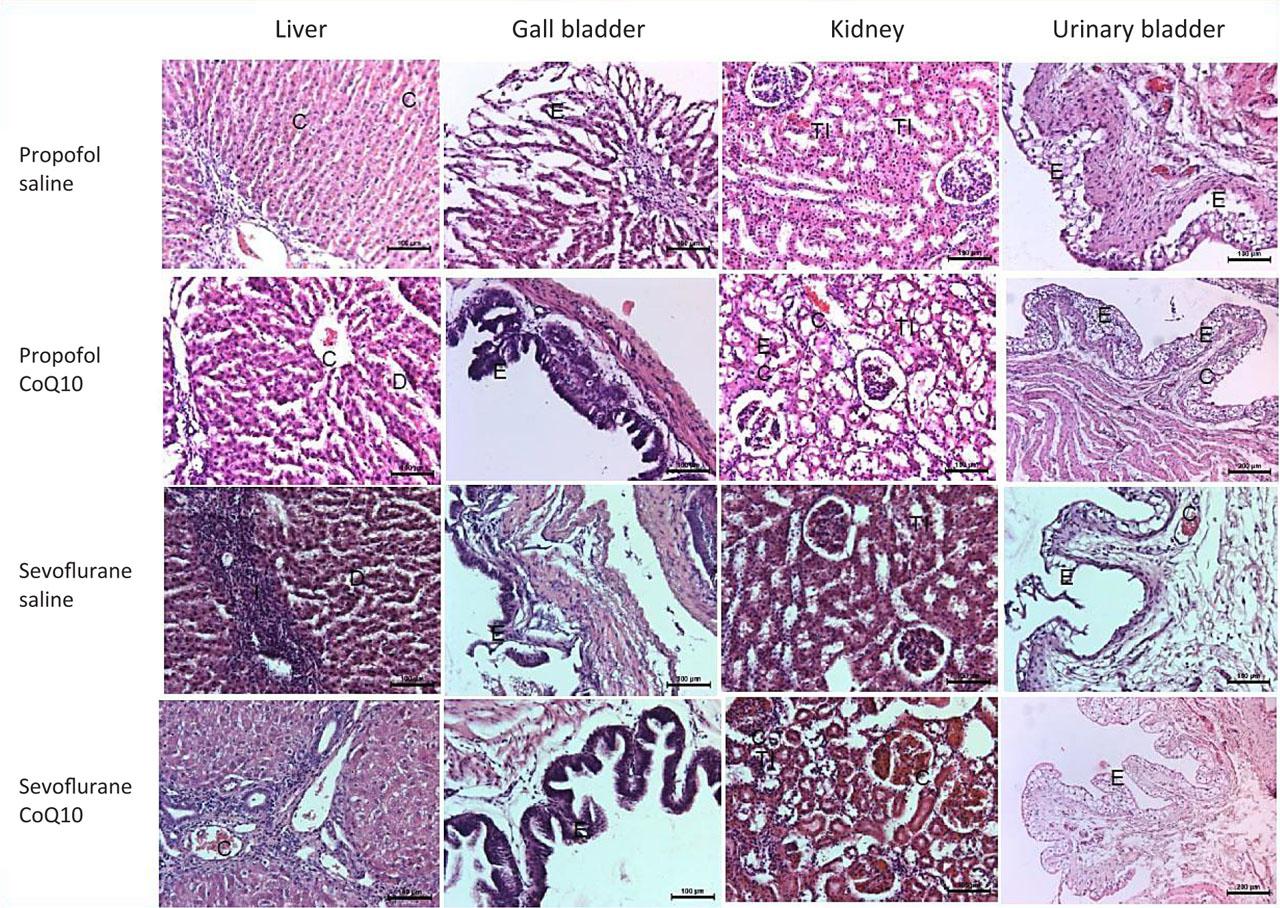 Light micrographs of the liver, gall bladder, kidney, and urinary bladder after the propofol or sevoflurane exposure with respect to saline or additional CoQ10 therapy (hematoxylin and eosin; 200×). The propofol and sevoflurane organ toxicities were recovered up to different extents with CoQ10 therapy. The desquamated mucosal epithelia recovered in the gall bladder and the urinary bladder with CoQ10 (the second and fourth column light micrographs). The portal inflammation, hepatocytic vacuolation, sinusoidal congestion, and dilatation partially improved with CoQ10 treatment (the first column). The kidney damage, which consisted of mainly vascular congestion and tubular injury, did not change much with the CoQ10 treatment (third column). C, vascular congestion; CoQ10, coenzyme Q10; D, dilatation; E, epithelium; I, inflammation; TI, tubular injury.