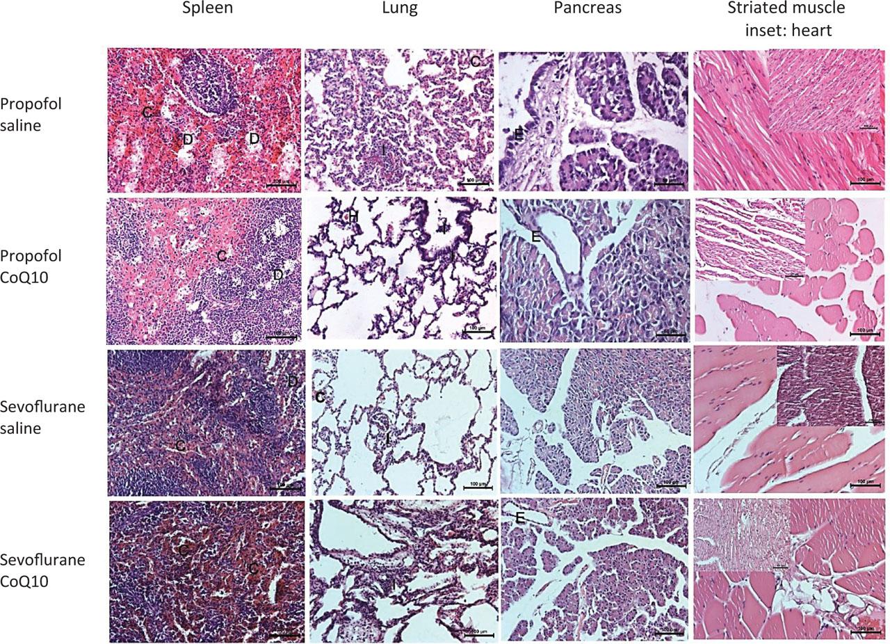 Light micrographs of the spleen, lung, pancreas, and striated muscle (the heart) inset after the propofol or sevoflurane exposure with respect to saline or additional CoQ10 therapy (hematoxylin and eosin; 200×).