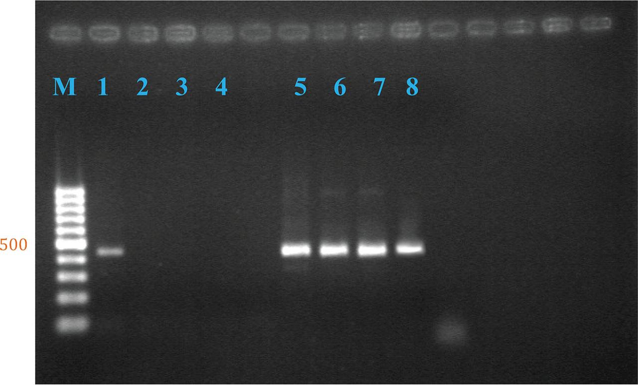 Dengue RNA was detected in the cellular compartment of mobilized bone marrow-derived hematopoietic stem cells by RT-nested PCR targeting the dengue envelope region. The RT-nested PCR products were separated on 2% agarose gels along with the DNA marker indicated on the left side in base pairs (M). Lane 1 = mobilized hematopoietic stem cells, lane 2 = cell-free compartment (supernatant), lane 3 = cell pellet fraction, lane 4 = negative control. Lanes 1–4 are all from blood collected after G-CSF administration; dengue RNA was not detected in any fractions from pre-G-CSF blood (data not shown). Lanes 5–8 = dengue serotypes 1–4, respectively, as positive controls. G-CSF, granulocyte colony-stimulating factor; PCR, polymerase chain reaction; RT, reverse transcription.