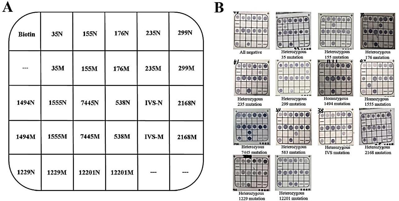 Schematic representation and results of hearing loss gene chip. (A) The schematic representation of the location of the probes dotted in the hearing loss gene chip used for the reverse dot blot assay. N represented the location of wild-type probes. M represented the location of mutant probes. (B) Part of the hybridization results of hearing loss gene chip, which included heterozygous, and homozygous gene mutations. (-) presented no probe at the corresponding position in the hybridization membrane.