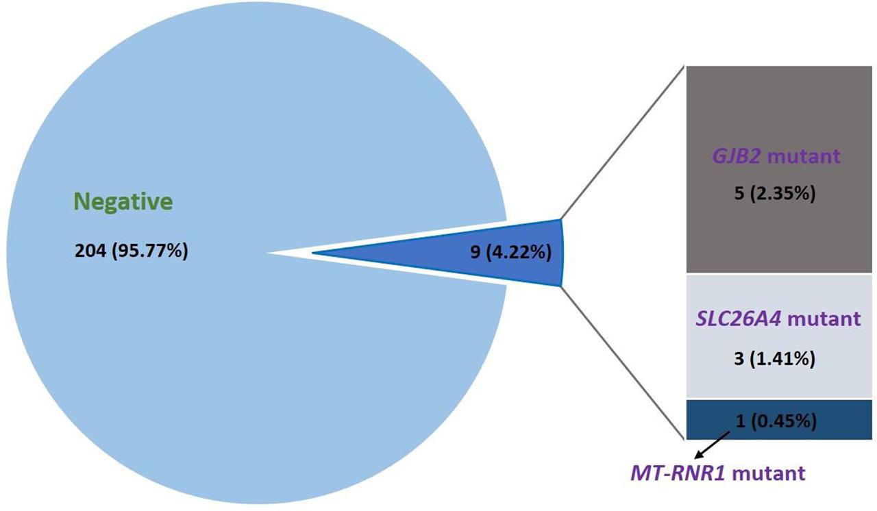 In the Chinese population, nearly 50% of cases of NSHL are associated with mutations in the following genes: GJB2 (OMIM: 121011), GJB3 (OMIM: 603324), SLC26A4 (OMIM: 605646) and the mitochondrial gene MT-RNR1 (OMIM: 561000) [4]. The mutation frequencies of GJB2, GJB3, SLC26A4, and MT-RNR1 in Chinese NSHL patients are 27.13%, 2.01%, 20.85%, and 2.26%, respectively [5]. The five-most common mutations (c.35delG, c.155_158del4, c.176_191del16, c.235delC, and c.299_300delAT) of GJB2 are associated with congenital deafness susceptibility in the Chinese population [6, 7, 8]. c.235delC, which is the most prevalently observed pathogenic mutation accounting for 88.0% of all mutant sites identified [9, 10]. Similarly, in the SLC26A4 gene, IVS7-2A>G, c.1229C>T, and c.2168A>G are the top 3 most common deafness-related mutations in the Chinese population, including Taiwanese [11, 12, 13]. As another important deafness-related gene, mitochondrial gene MT-RNR1, a meta-analysis demonstrated pooled prevalence in the general population for MT-RNR1 gene mutations (m.1494C>T, m.1555A>G, and m.7445A>G) was 2% (1%–4%) at 99%, which makes routine screening in high-risk Chinese populations justified [14]. More recently, m.12202T>C mutation is confirmed to be associated with non-syndromic deafness. The prevalence of m.12202T>C in Chinese hearing-loss patients is reported about 0.11% [15]. In addition, mutations in GJB3 were originally identified to underlie an autosomal dominant form of NSHL in China. And c.538C>T in GJB3 was previously considered to be responsible for high-frequency hearing loss [16]. However, recent studies showed that the incidence of the GJB3 c.538C>T variant has a very low incidence (0.40%) in Chinese hearing-loss patients [17]. In our study, we still include GJB3 c.538C>T variant in the detection system because screening for GJB3 in the Chinese population is still necessary and cannot be removed hastily.