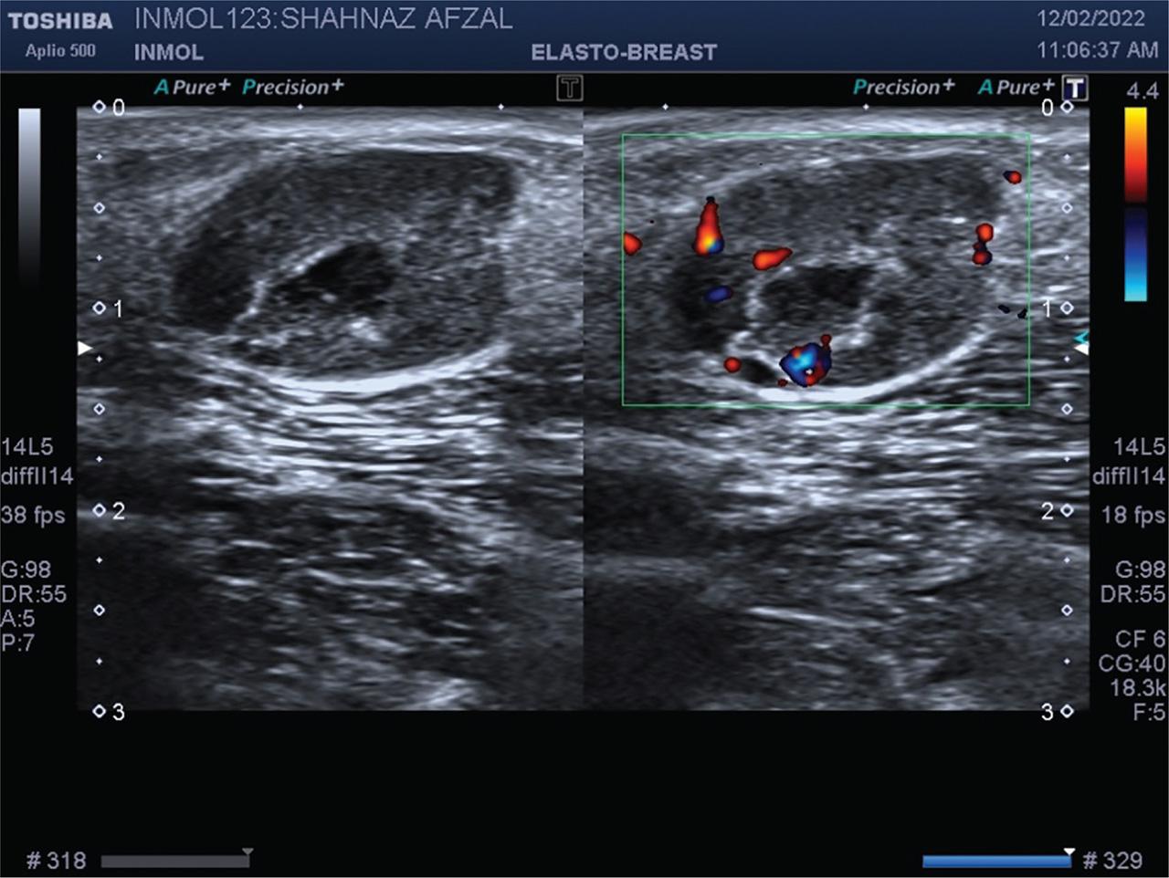 USG of cutaneous nodule revealed a 20 ×12 mm lobulated heterogeneous echogenicity lesion with internal necrotic changes in the subcutaneous plane of right axillary region, showing significant vascularity on color Doppler evaluation. USG, ultrasonography.