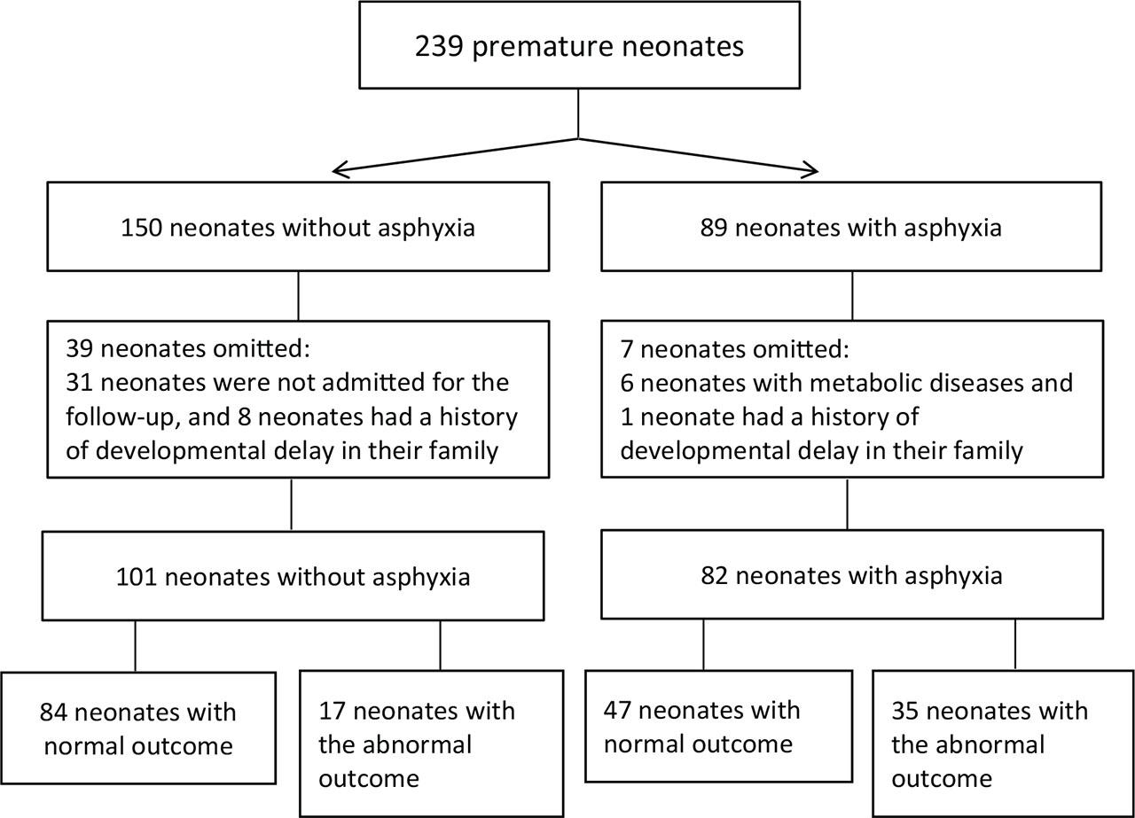 From the 239 premature neonates under study, we were able to follow up on 183 of the cases up to 2 years, and were not able to follow up on 46 cases (31 neonates were not admitted for the follow-up, 6 neonates were diagnosed with metabolic diseases, and 9 of them had a history of developmental delay in their family) (Figure 1).
