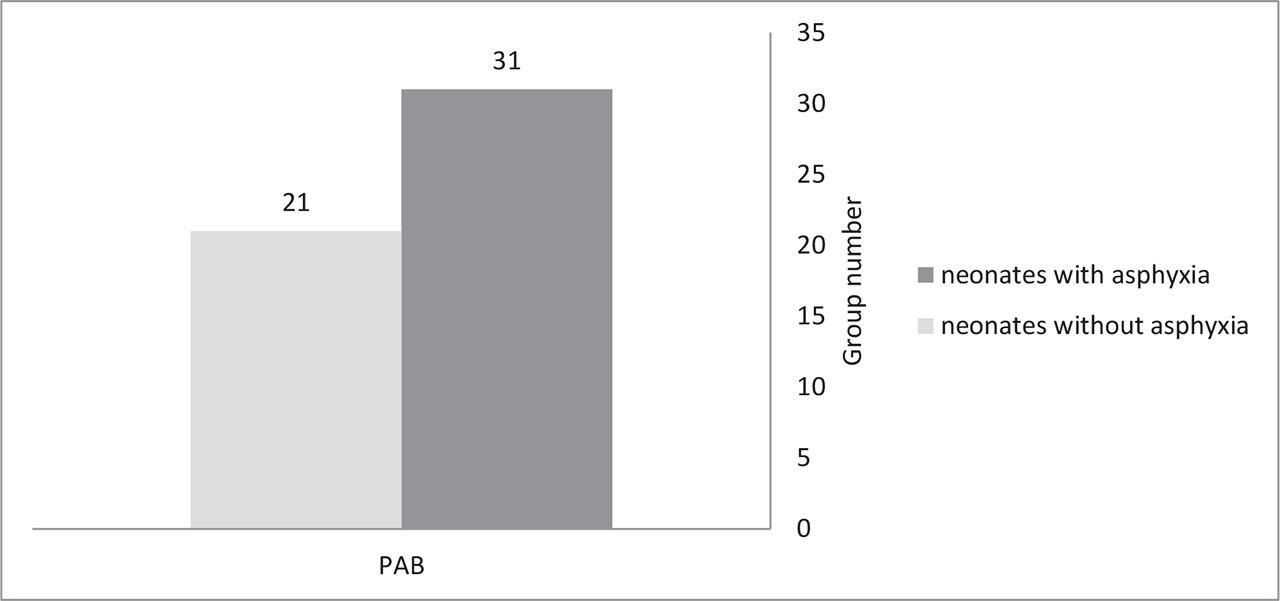 The comparison of mean PAB in neonates with and without asphyxia. PAB, prooxidant–antioxidant balance.