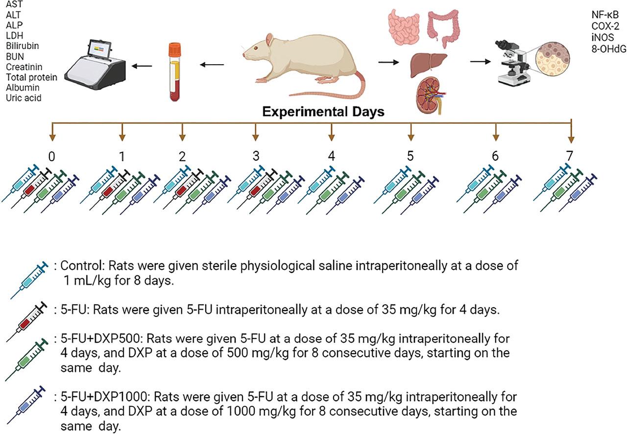 The literature review did not reveal any studies investigating the effect of DXP on systemic toxicity induced by 5-FU. This study aimed to examine the protective effects of DXP on 5-FU-induced hepatotoxicity, nephrotoxicity, and intestinal mucositis in rats.