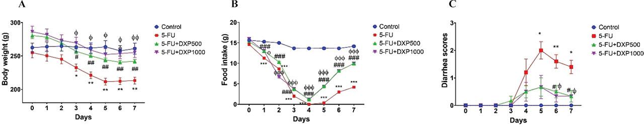 (A) body weight changes, (B) food intake changes, and (C) diarrhea score changes. *P < 0.05, **P < 0.01, and ***P < 0.001 are significant 5-FU group compared with control group; #P < 0.05, ##<I>P < 0.01, and ###P < 0.001 are significant 5-FU+DXP500 group compared with 5-FU group; ϕP < 0.05, ϕϕP < 0.01, and ϕϕϕP < 0.001 are significant 5-FU+DXP1000 group compared with 5-FU group according to one-way ANOVA post hoc Tukey test in Graph Pad Prism 8.0.1 software. 5-FU, 5-fluorouracil; DXP, dexpanthenol.