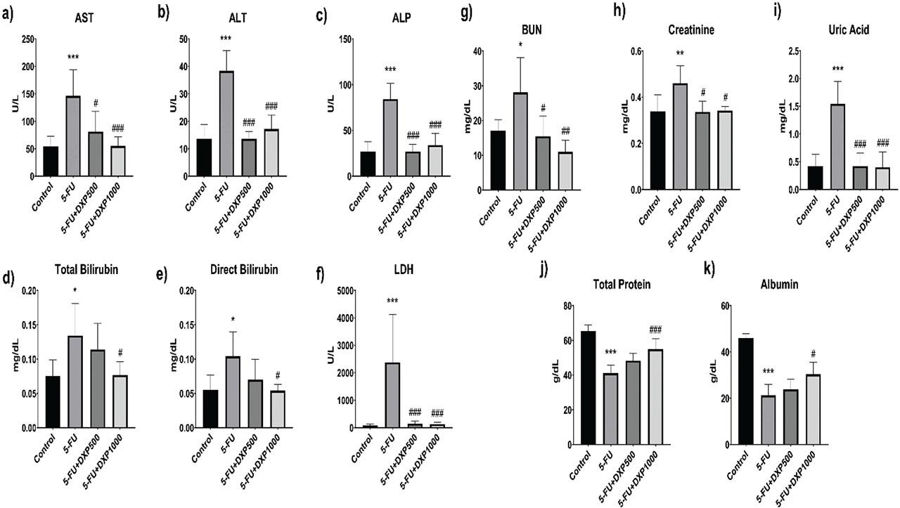Liver and renal biochemical analysis results. AST (a), ALT (b), ALP (c), total bilirubin (d), direct bilirubin (e), LDH (f), BUN (g), creatinine (h), uric acid (i), total protein (j), and albumin (k) level changes in groups. *P < 0.05, **P < 0.01, and ***P < 0.001 are significant 5-FU group compared with the control group; #P < 0.05, ##P < 0.01, and ###P < 0.001 are significant 5-FU+DXP500 and 5-FU+DXP1000 groups compared with 5-FU group according to one-way ANOVA post hoc Tukey test in Graph Pad Prism 8.0.1 software. 5-FU, 5-fluorouracil; ALP, alkaline phosphatase; ALT, alanine transaminase; AST, aspartate transaminase; BUN, blood urea nitrogen; DXP, dexpanthenol; LDH, lactate dehydrogenase.