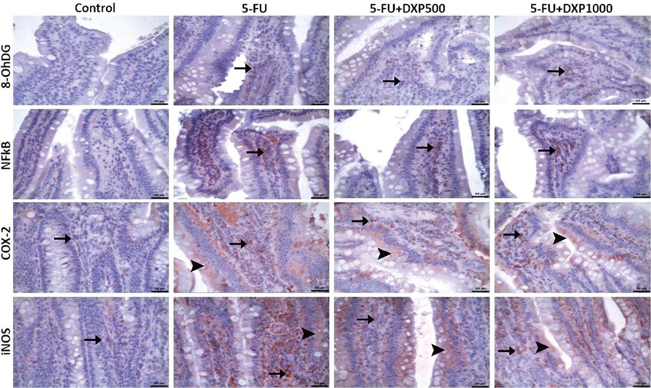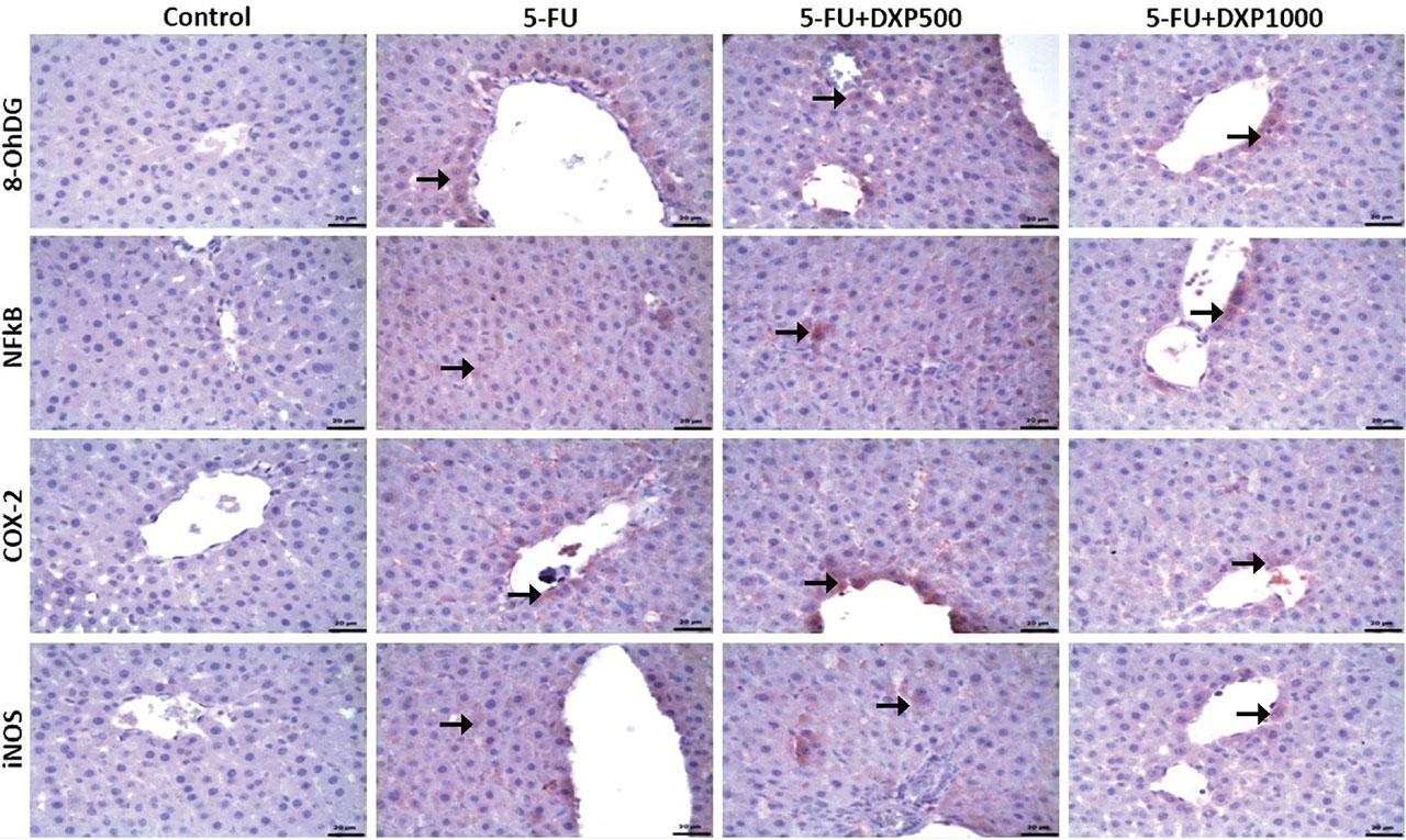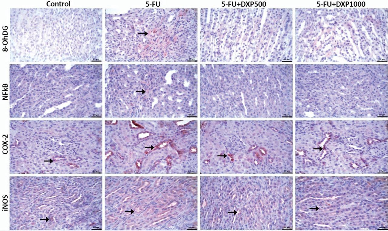 We immunohistochemically evaluated the effects of DXP on 5-FU-induced renal, hepatic, and intestinal toxicity by comparing the levels of NF-κB, COX-2, iNOS, and 8-OHdG molecules. In terms of these parameters, a significantly higher immunopositivity was detected in the 5-FU group, whereas this immunopositivity decreased in the DXP-treated groups.