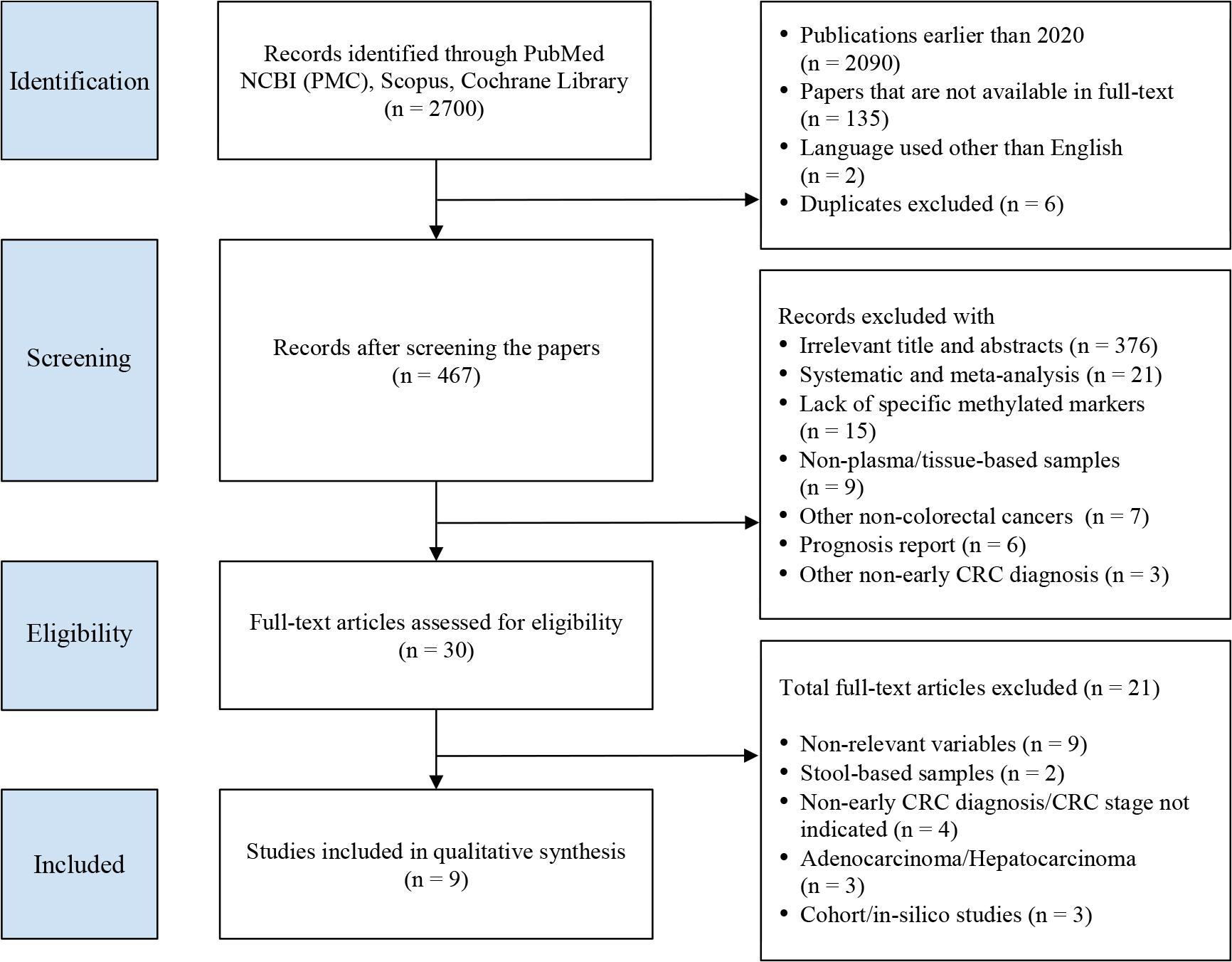 | 1 | Identifying potential DNA methylation markers in early-stage CRC, 2020 | [10] | FFPE tissue; Blood plasma | 37 | 14 | 34–77 | 36 | 6 | SFMBT2, VAV3-AS1, ZNF132, KCNQ5, ITGA4, THBD, FBN1, EVC, C9orf50, TWIST1, ZNF304 |