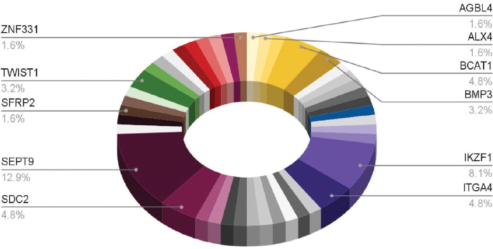 | 6 | 10.1038/s41416-023-02337-4 | Blood Plasma | MagMAX Cell-Free DNA Isolation Kit (Thermo Fisher Scientific) | MSP with Zymo Lightning Conversion Reagent | AGBL4, ALX4, BCAT1, BMP3, FLI1, GRIA4, IKZF1, NDRG4, NPTX2, PRIMA1, RARB, SEPT9, SDC2, SFRP1, SFRP2, SLC8A1, TWIST1, VIM, WNT5A, ZNF331 |