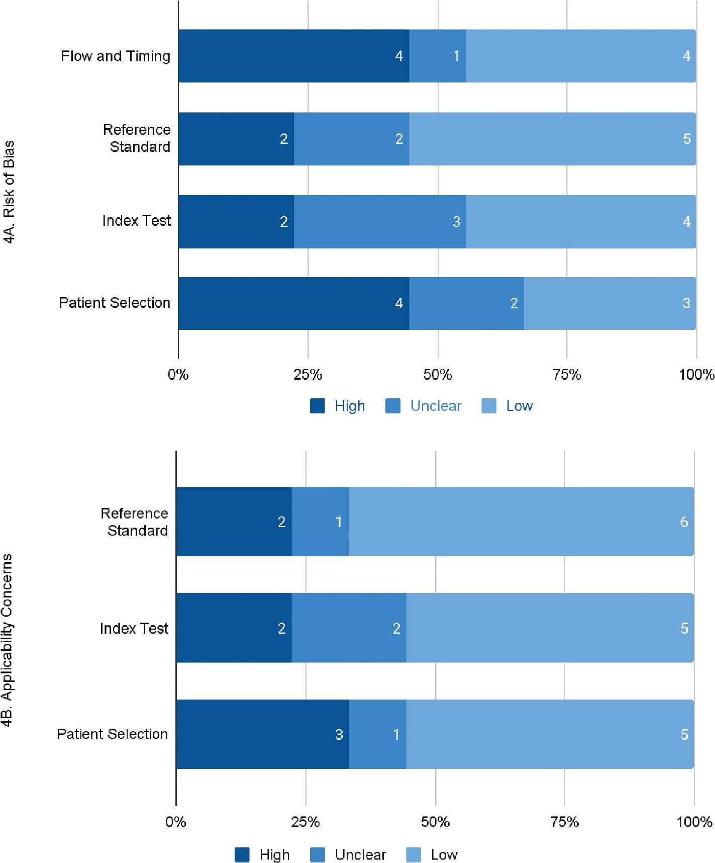 Quality assessment ratings using the QUADAS-2 scale for reviewed studies (n = 9)