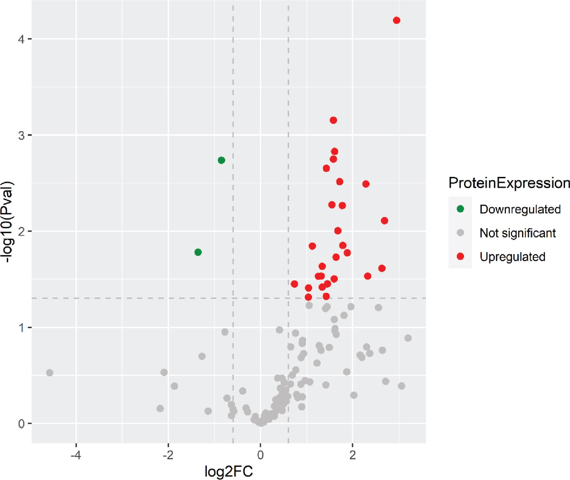 A total of 348 urinary proteins were identified by LC-MS/MS in both NC and VC participants. In the NC group, 28 urinary protein excretion rates were significantly different between the two groups: including 26 proteins up-regulated and 2 proteins down-regulated (Table 2 and Figure 1).