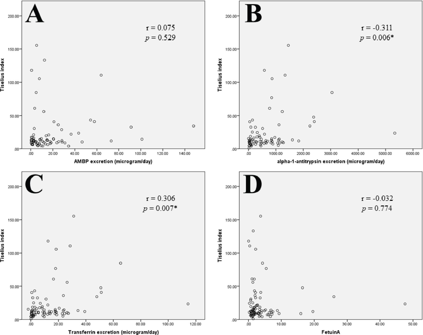 Comparison between the Tiselius urinary supersaturation index (×10-5) and the urinary excretion rate of (A) AMBP, (B) alpha-1-antitrypsin, (C) transferrin, and (D) fetuin-A, *P < 0.05. AMBP, alpha-1-microglobulin/bikunin precursor.