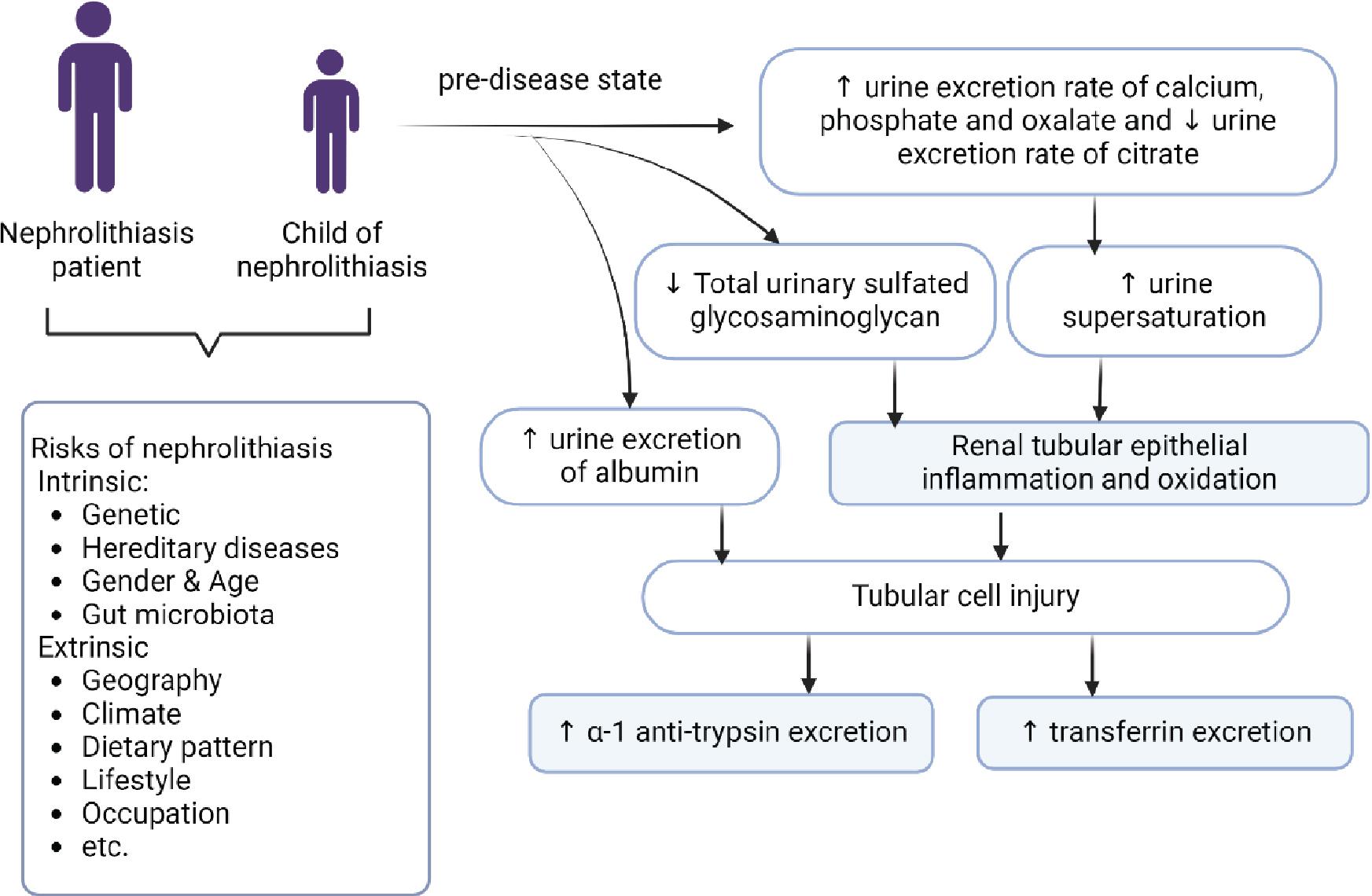 Hypothesis of the elevation of urinary AAT and transferrin protein in children of patients with NL (Created by BioRender.com). AAT, alpha-1 Antitrypsin; NL, nephrolithiasis.